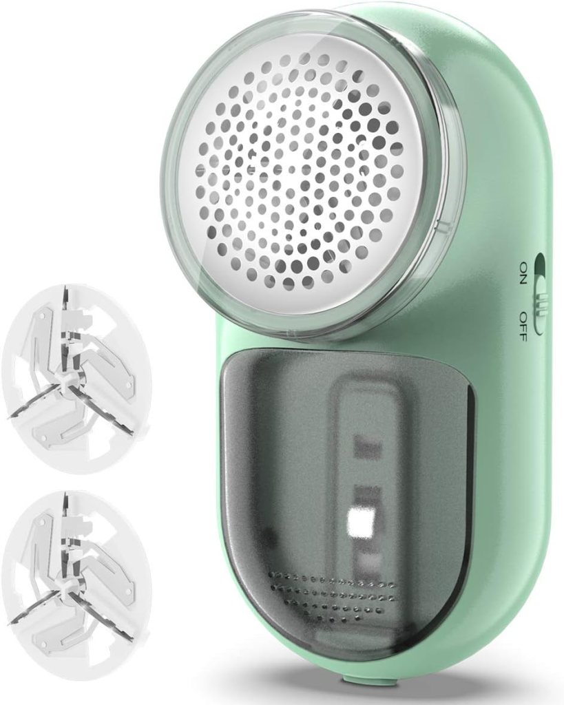 This one is my favourite; it’s chargeable, so I can take it with me when I travel, and it’s got a cashmere brush on the back. It also vacuums up the shaved wool, so you can see how much was taken off. When using this, I recommend you pay extra attention to the bottom of sleeves (near the wrists), around the neck, and under arms, as these areas see a lot of movement and are prone to pilling. Works great on cotton pillow cases and older sofas, too!